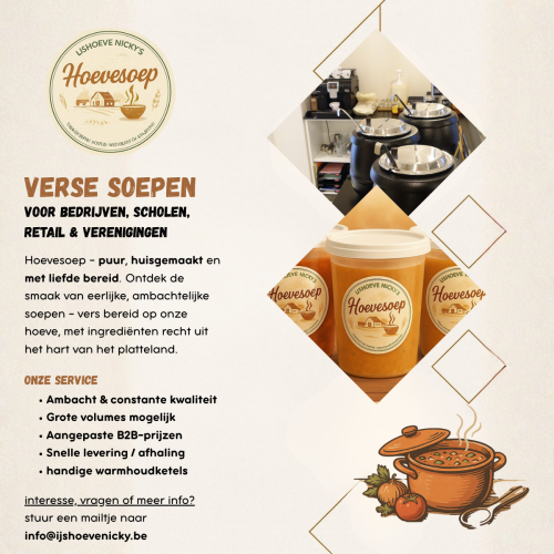 Op onze hoeve bereiden we dagverse ambachtelijke soepen op basis van kwaliteitsvolle ingrediënten en pure smaken. Wat startte als een product voor onze winkel, groeit nu uit tot een professionele oplossing voor bedrijven, scholen, verenigingen en events die kiezen voor betrouwbare kwaliteit aan scherpe B2B-voorwaarden.
